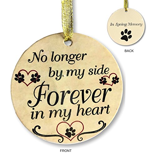 PET MEMORIAL FRAME AND ORNAMENT SET. Beautiful ceramic frame and ornament bundled together, each printed with no longer by my side, forever in my heart. Touch the heart of a friend or family member by honoring the memory of their pet with this thoughtful gift set. They will be able to display the picture frame all year long and can hang the ornament on the Christmas tree during the holidays.