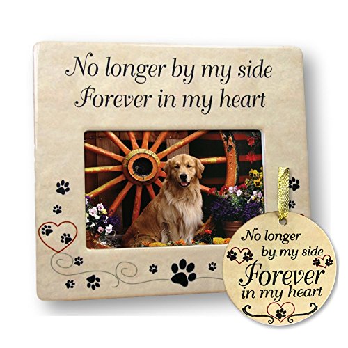 NO LONGER BY MY SIDE. Nice saying to honer the loss of your favorite furry friend. You will always remember how they used to stay right by your side. The ceramic picture frame will hold a 4" x 6" photograph.