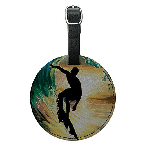 Product Description This is an awesome leather luggage tag that will set your luggage apart in style. The tag is made of black leather and the design shown is printed on one side with special inks. A card for your address information (included) slips inside and is protected by a clear vinyl window. The tag is approximately 4.0" (10.2cm) in diameter. A leather strap is also included. Sold individually. 0