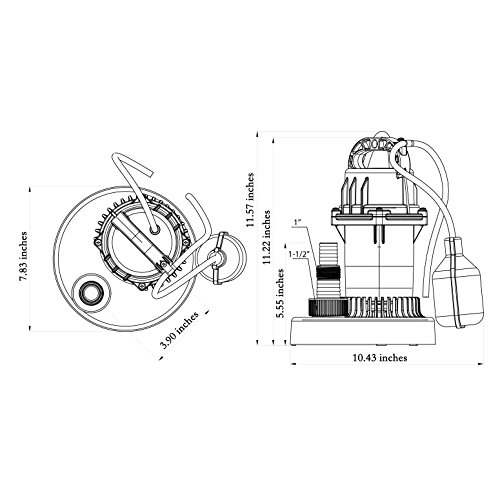 NPT 1 inch discharge; Included hose adapter fits 1-1/2, 1-1/4 or 1 inch hose; Automatic on/off action with mechanical float switch for convenient operation