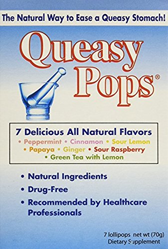 Say goodbye to your queasy, upset stomach - the natural way. Effective for all sorts of nausea due to traveling, motion sickness, chemotherapy, illnesses, colds and flu, pregnancy, morning sickness, chemotherapy, car rides, airline travel, amusement park rides, dizziness, medications , even anesthesia or post-surgery. Made with powerful essential oils of fruit and plant botanicals that have been proven to relieve nausea. All-natural, completely drug-free and chemical-free so it's 100% safe for kids, adults, elderly, and pregnant moms. Great tasting, fast-acting and highly effective at combating your nausea and upset stomach with absolutely no side effects. Zero artificial flavors or colors and certified kosher. Individually wrapped for convenience so they are perfect to take along in your purse, computer bag, pocket, backpack, luggage, briefcase, diaper bag, lunch bag or to always keep handy in the glove compartment of your car. Recommended by doctors and healthcare professionals. Three (3) boxes of our most effective flavors containing the nausea-relieving essential oils of sour lemon, sour raspberry, ginger, peppermint, papaya, green tea with lemon and cinnamon; 7 individually-wrapped lollipops per box. See all our three lollies products: preggie pops and drops for strong morning sickness relief; preggie drops plus with 10 milligrams vitamin b6 for extra-strong morning sickness relief; organic preggie pop drops made with USDA certified organic essential oils; queasy pops and drops for all-purpose nausea relief due to sickness, traveling, car or air travel, pregnancy, morning sickness, medications, even chemotherapy and post-anesthesia; queasy drops pink sour raspberry that supports breast cancer awareness and provides quick, strong nausea relief from chemotherapy, anesthesia or cancer medications; and our special line just for kids, queasy pops kids. Each piece is individually wrapped to stay fresh and go with you anywhere.Feature
