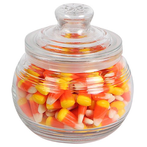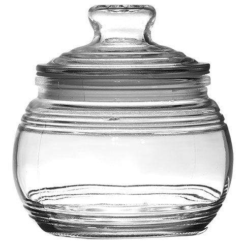 - 19-oz. glass candy jars with ribbed accents and tight-sealing lids.