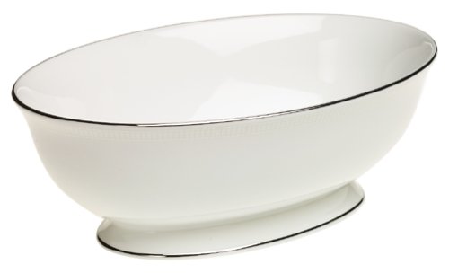 Amazon.com With its refined and city-smart look, this Lenox Tribeca open vegetable bowl makes a stylish addition to intimate meals or celebrations. Taking its name from a highly fashionable Manhattan neighborhood, Tribeca combines fine bone china with precious platinum. The materials are used generously in this piece, resulting in a substantial weight and a handsome, assertive presence. Bordered with an embossed tone-on-tone train track pattern, the bowl features gleaming bands of platinum at the rim and foot. It measures 9-1/2 by 6-1/2 by 3-1/4 inches and is safe in the dishwasher. Like the rest of the Tribeca pattern, the bowl carries Lenox's lifetime replacement policy. --Emily Bedard 0