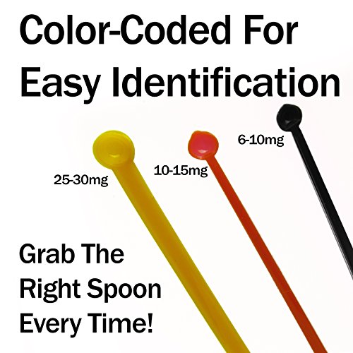 COLOR-CODED FOR QUICK IDENTIFICATION. Don't let your spoons get mixed up in the drawer! Know that you're grabbing the right milligram measuring spoon for powder measuring in your nootropic stack!