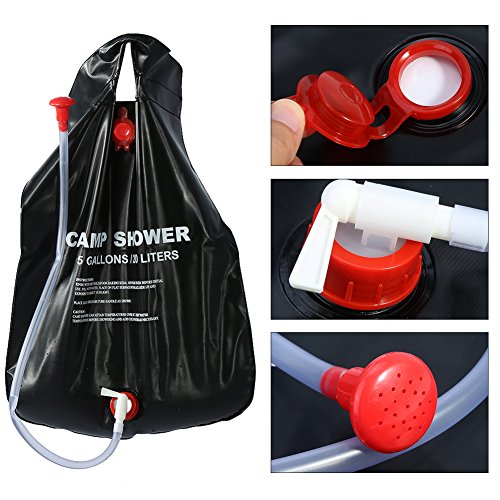 -. Feature : MATERIAL:Made of non-toxic and environmentally friendly PVC material,holds up to 5 gallons, enough water for multiple showers. / USE SOLAR ENERGY TO HEAT WATER:Heats Water Uses solar energy, just put under the sun and enjoy your warm shower. / EASY TO USE:Equipped with a shower head and a tap, a shower pipe with flexible shower hose with On/ Off nozzle slider,it is very convenient to control water. / EASY TO CARRY:This shower bag can be folded away into a small size for easy storage. Light weight and compact great for backpacking. / MAKE YOU KEEP CLEAN:It is quite a good product to make you clean and feel more comfortable after a long time expedition.It can be hung on tree branches to take a bath when you are camping or hiking.Complete with hanging bar and rope system, It can be hung on a car or tree branches and more.
