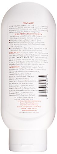 ReleaseDate : 2014-09-08 Studio : Fantasia Publisher : Fantasia Binding : Health and Beauty Product Description Shine creme is an every day, leave-in conditioner enriched with aloe and vitamins. Straightens, smoothes and adds body to hair. For blow styling and hot iron techniques. Adds volume and superb shine to hair. Feather lite formula that is not oily or greasy. Moisturizes and repairs split ends. Strengthens and eliminates dry, frizzy, damaged hair. Detangles and protects hair against breakage from heat appliances and chemicals. Alcohol free. 0