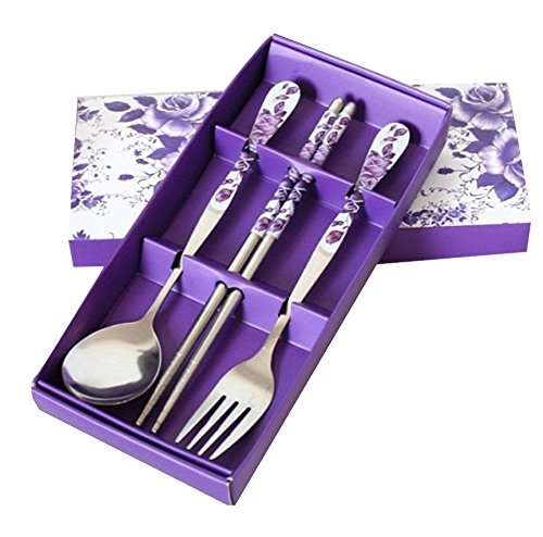 Romantic Rose Stainless Steel Metal Chopsticks Spoon and Fork Set with Stylus Purple
