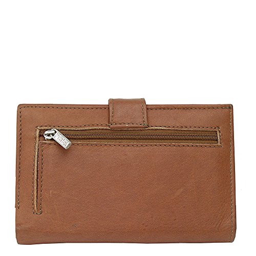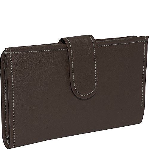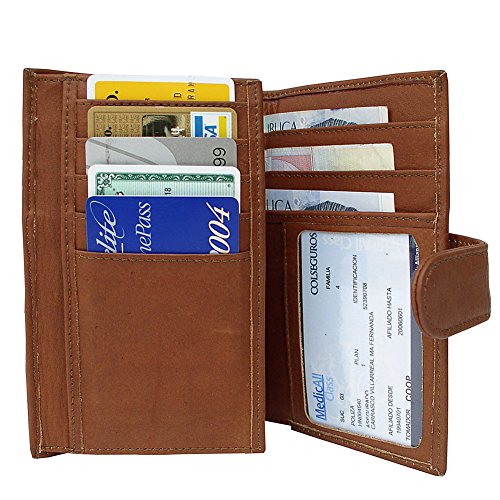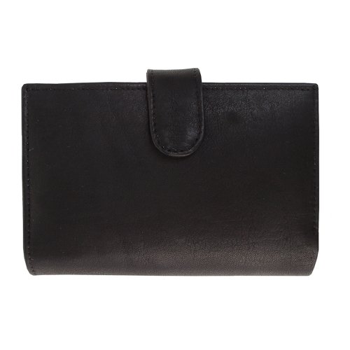 Snap opening to main credit card organizer, window id pocket, three currency slide pocket and two open pockets. Rear zip-pocket.