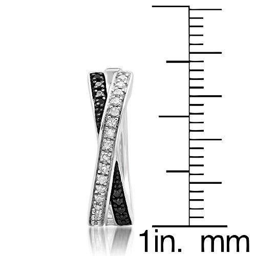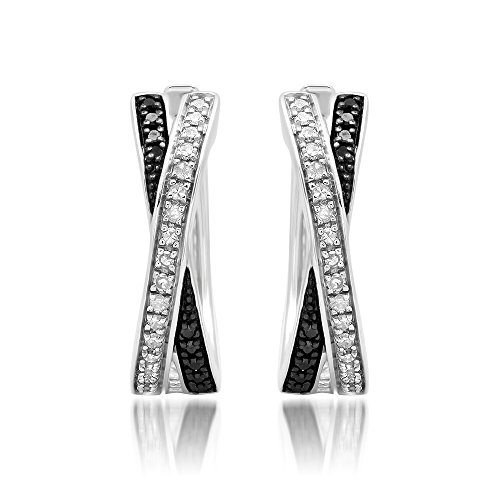 Hinged hoop earrings with crisscross fronts featuring half channels of white and black diamonds