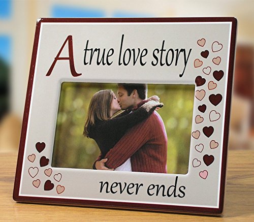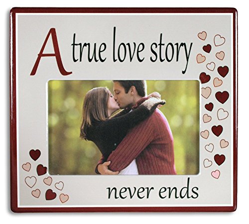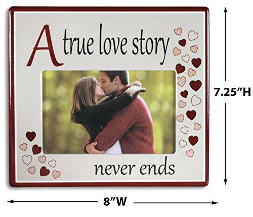 A True Love Story Never Ends Picture Frame - Red Hearts with Saying on Ceramic Frame - Anniversary Gift - 4x6 Inch Photo