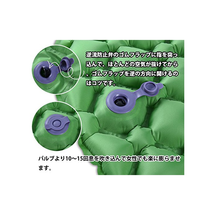 『소재 기능 업』메인 소재는 초경량 양질의 20D나일론 옷감에 촉감이 매우 좋습니다.그 위에 립 스톱 이라고 하는 특성이 가지고 있기 때문에 간단하게는 찢어지지 않습니다.PAT특허 밸브에 10~15회식을 들어오면 에어 매트를 간단하게 부풀어 오르게 합니다.