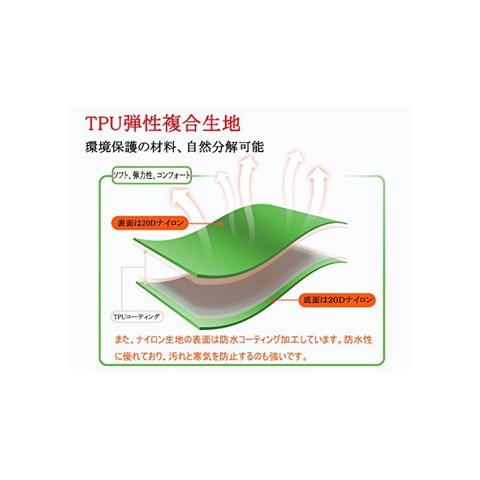 『환경에 친절하다』내층에는 에코TPU코팅이 세워져 있습니다. 고무와 같은 탄력성이 있는 소재에,내구성 방수성에 뛰어나고 있고, 얼룩과 한기를 방지하는 것도 강합니다.게다가에어 매트의 표땅은 방수 코팅 가공으로 방수성이 높아집니다.