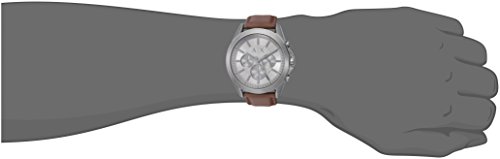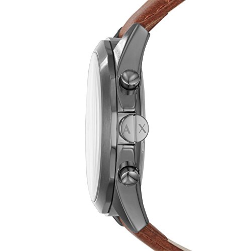 Brand, Seller, or Collection Name:A|X Exchange Model number:AX2605 Part Number:AX2605 Model Year:2017 Item Shape:Round Dial window material type:Mineral Display Type:Analog Clasp:Buckle Case material:Stainless steel Case diameter:44 millimeters Case Thickness:12 millimeters Band Material:leather calfskin Band length:Men's Standard Band width:22 millimeters Band Color:Brown Dial color:Grey Bezel material:Stainless steel Bezel function:Stationary Calendar:Date Special features:Chronograph, measures-seconds Item weight:8.80 Ounces Movement:Quartz Water resistant depth:165 Feet