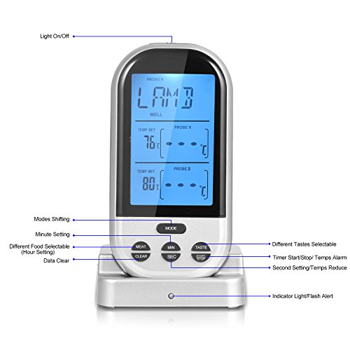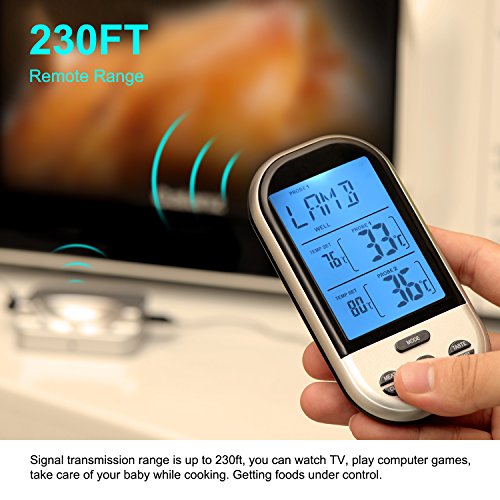 Strong Features: Three Probes: Measure temperature of food and oven or 2 kinds of food at the same time Count Up Down Timer: Count up like a stopwatch timer alert (max 9hr 59min 59sec) Programmable Temperatures: 8 selectable meats 5 alternative doneness levels, you can reset as you desired Smart Temperature Alarm: Beep (30s) and flash when temperature reaches the target value 230ft Remote Range: You can be away from kitchen while monitoring meat temps, say goodbye to burned food Upgraded IPX7 Water Resistance: 3 stainless steel probes are all waterproof and can be washed with water (Not for transmitter and receiver) Backlit LCD Display: With the blue backlight, instant reading about 5 digits (food/oven temps and timer) Wide Application: Perfect for cooking, meat, BBQ, grill, oven, smoker, kitchen Auto Pairing When Power On: Synchronous transmitter receiver, easy reading and hassle-free setup