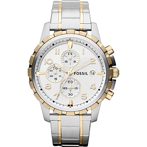 Stainless steel watch in gold- and silver-tone finish featuring white textured dial with chronograph functions, date window, and gold-tone hands and indices