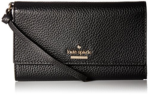 A pebbled Kate Spade New York wallet with a snap-tab flap and a slim back pocket. Lined, 2-compartment interior with a phone compartment, a zip compartment and 5 card slots.