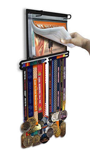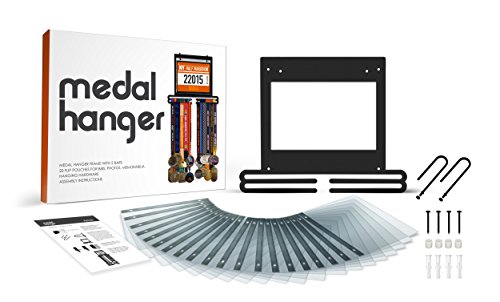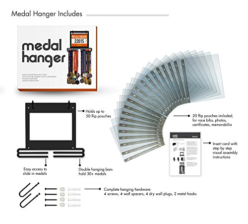 - ✔ INCREDIBLE VALUE: ▸ Medal hanger frame with two hanging bars ▸ 20 PVC flip pouches ▸ Hanging hardware ▸ Assembly instructions ▸ Attractive gift box. Perfect for marathon, triathalon and running medals. Sports medals from swimming, wrestling, gymnastics, karate, hockey, dance, soccer