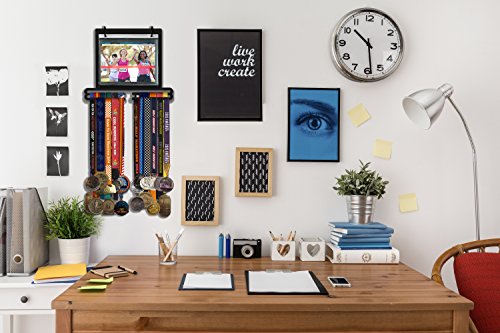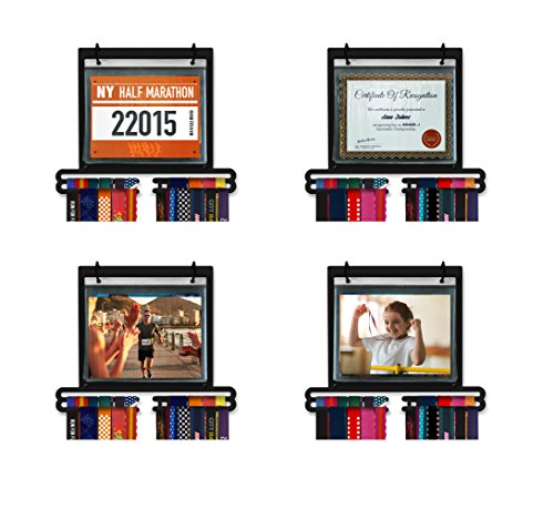 - ✔ TWIN HANGING BARS TO HOLD MORE MEDALS: ▸ Holds 40 plus medals and 100 Race bibs (50 flip pouches) ▸ No extension bar required. ▸ Easy slide in and slide out of medals, from center of frame ▸ Size: 13.8 x 11.2 inches