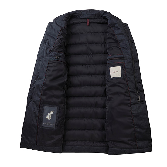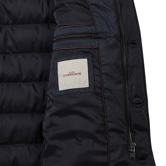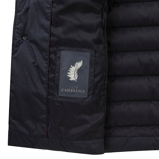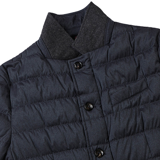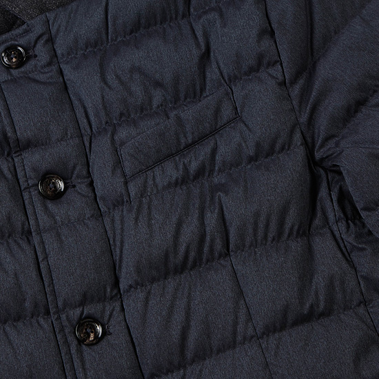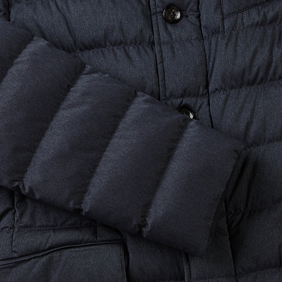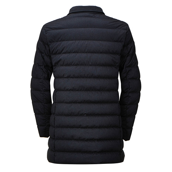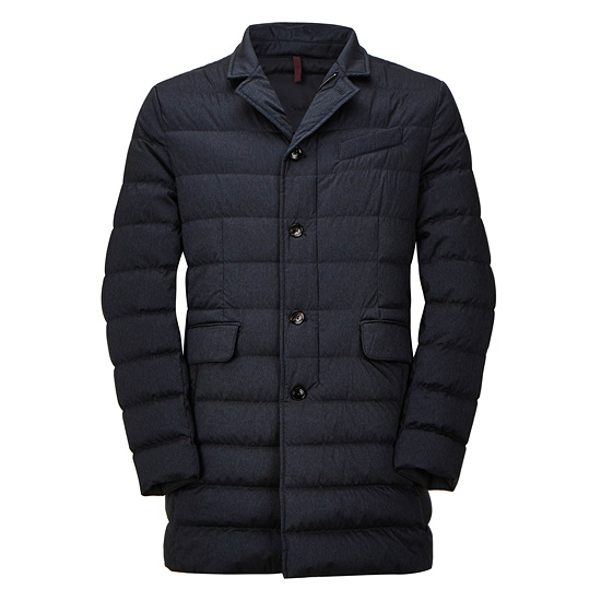- 모노톤 컬러의 가로 스트라이프 퀼팅을 적용하여 세련된 남성 코트.