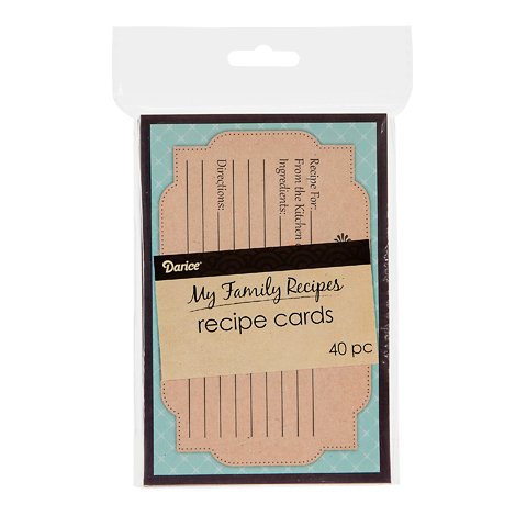 Studio : Darice Publisher : Darice Binding : Kitchen Product Description Darice Recipe items to keep your treasured family recipes safe and secure. Choose the style that best fits your need and compliments your kitchen. Card Teal and Kraft 40pc- Recipe card is printed with an area for writing vital recipe information. Background of recipe area is like an ornate Kraft-colored label sitting on a Teal background with a Dark Chocolate border. Cards measure about 6"x 4". Coordinates with Recipe Box #DAR1219.561 sold separately. 0