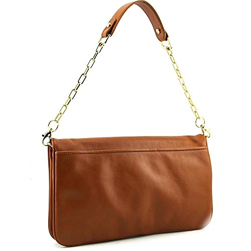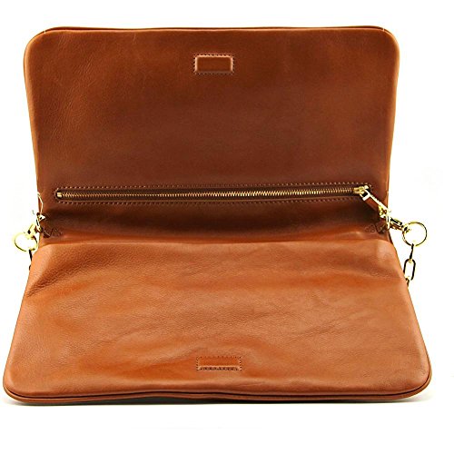Tory Burch's Bombe Reva is wrapped in beautifully tanned, soft distressed luggage brown leather with polished golden tone hardware. The front is accented with an oversized Stacked-T logo and the flap top secures with dual hidden magnetic closures. It features two zippered compartments, each lined in khaki twill fabric. The Bombe Reva is versatile, featuring a leather and golden chain woven strap that can be worn on the shoulder, or detached so you can carry it as a clutch. The strap has a drop of about 12 inches and attaches with swiveling dog leash style clasps just under the flap. This beauty measures approximately 12 inches (L) x 6.5 inches (H) x 1 inch (W).Feature