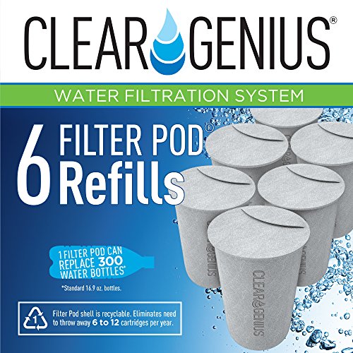 WHY CLEAR GENIUS? Clear Genius is a reusable water filtration system that fits Brita, Clear Genius and Pur water pitchers. Clear Genius reusable cartridges drastically reduce the waste created by discarding disposable plastic filters. Clear Genius provides those who currently use Brita, Clear Genius and Pur water pitchers a better way to filter water, allowing you to achieve a more environmentally conscious and cost effective result. HOW IT WORKS. Clear Genius water filtration system turns tap water into healthy, great tasting drinking water. Tap water is filtered through a blend of activated carbon and ion exchange resin, all contained within a non-woven, shell which also serves as a filtration element, to prevent black flecks. One Clear Genius Filter Pod Refill: Reduces harmful contaminants without removing minerals your body needs, filters 40 gallons of water - the equivalent of 300 (16.9 oz.) containers of bottled water, provides a more eco-friendly way to enjoy great tasting water, and reduces environmental waste by removing the need to discard approximately 6-12 plastic filter cartridges per year (based upon average household daily consumption of 0.5 gallons per person) as is typically the case with other leading brands.Feature