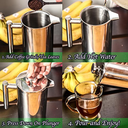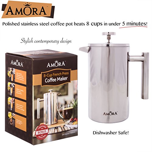 Amora's French press coffee maker delivers 8 cups (1 liter) of your favorite tea or coffee in less than 5 minutes.