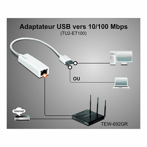 The TU2-ET100 is a high speed USB network adapter that allows you to instantly connect to a 10/100Mbps network from a USB enabled desktop or Notebook PC. Compliant with USB 2.0 and backwards compatible with the USB 1.0 and 1.1, you can share files and printers and also gain access to broadband Internet to explore valuable resources on the web. Features : Compliant with USB 2.0 and 1.1 specifications, Compliant with IEEE 802.3, 802.3u standards, Supports both full-duplex and half-duplex operations, Supports suspended mode and remote wake-up through link-up or magic packet, Supports IPv6, Compliant with Windows 7/Vista/XP, Mac OS X 10.4~10.6, Powered by USB port. No external power adapter required, Diagnostic LEDs