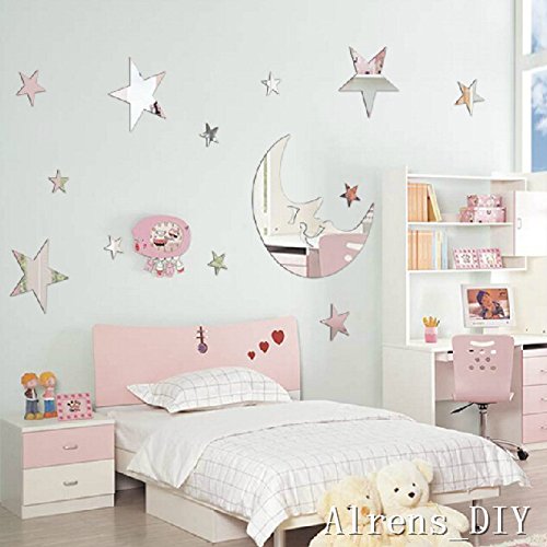 1 pcs Moon+ 12 Pcs Twinkle Stars DIY Mirror Effect Reflective 3D Wall Stickers Home Decoration Living Room Bedroom Bathroom Nursery Kindergarten Kid's Room Decor Mural Decal Art (Silver)