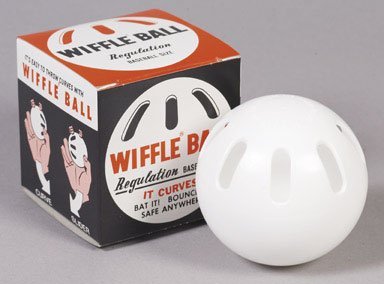 The WIFFLE ball was designed to take the place of baseball, stickball and softball for boys and girls in back yards and city streets. It is made of a tough rubbery plastic is light in weight and cannot be thrown or hit any great distance. The WIFFLE ball is also an excellent indoor ball.