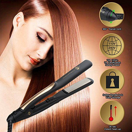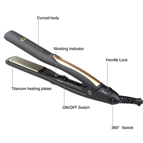 - Perfect for short styles, touch ups, or working on small areas with details - 9" long perfect for travel - Titanium plates distributes heat quickly and evenly ,glids down hair for silky smooth looking - 30 seconds instant heat-up - Max 410°F deliver salon results - Curved body and beveled plates for optimal styling - Handle lock for easy storage-Safe lock,you can push on the lock when you done it,easy for taking and storage. -360° Swivel cord- A 1.8 metre (m) swivel cord for manoeuvrability and longer reach. One-year's warranty