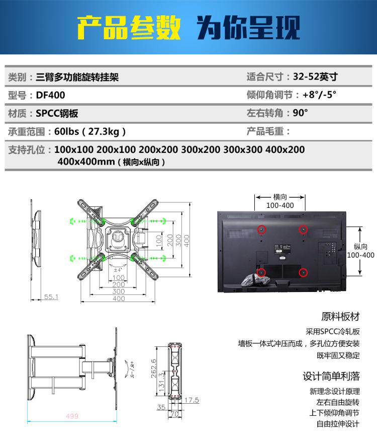 When the extension arms are added to the mount, it can fit VESA 300x300 and the common VESA 400x400 pattern.