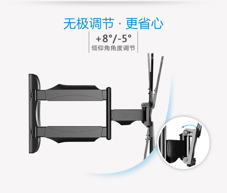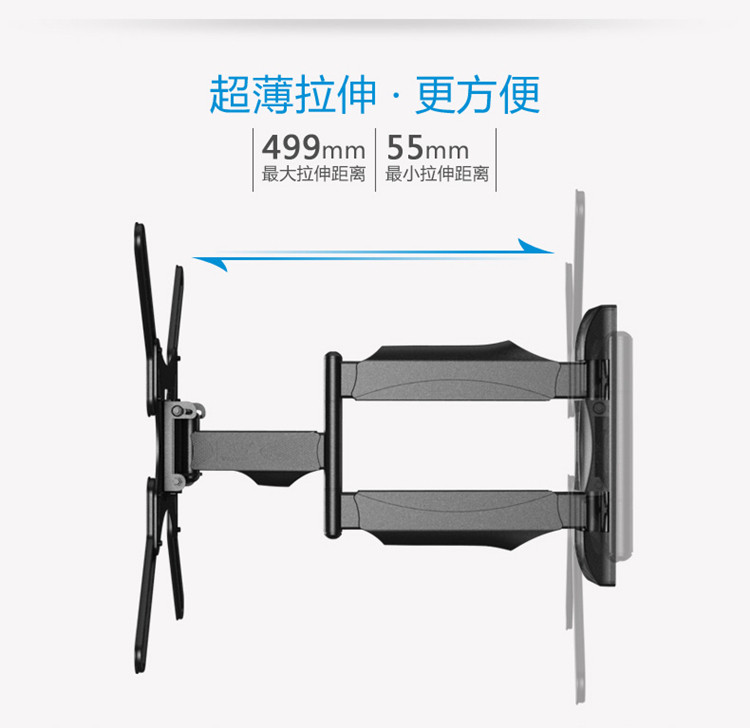 Weight limit is 44lbs. This mount provides 18" of extension and collapses to 3.4" from the wall.