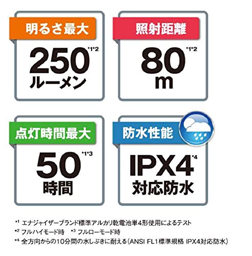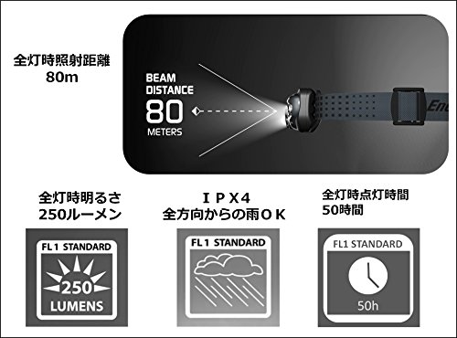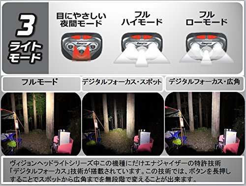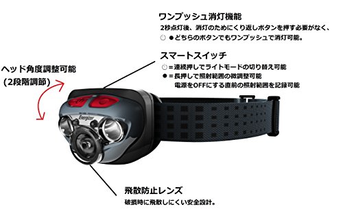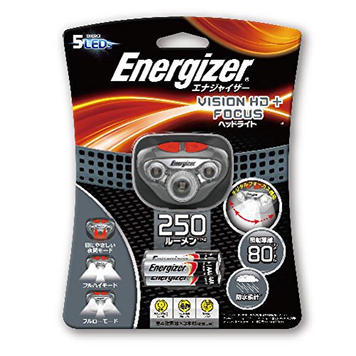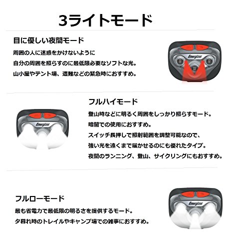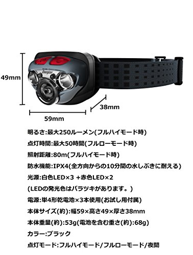 Studio : Energizer (Energizer) Publisher : Energizer (Energizer) Binding : Sports Product Description Country of origin: China Brightness: up to 250 lumens (full high mode) Lighting time: up to 50 hours (full low mode) Irradiation distance: 80m (full high mode) Waterproof function: IPX4 (resistant to splashes of 10 minutes from all directions) Light source: white LED ~ 3 red LED ~ 2 (emission color of the LED is there are variations.) Power supply: AAA batteries ~ 3 this use (included for trial) Body size (approximately): width 59 ~ height 49 ~ thickness 38mm Body weight (approximately): 53g (68g case, including the battery) Color: Black Lighting modes: full high mode / full low mode / night Freely adjustment of the head angle Fit to head band Equipped with adjustable digital focus function the irradiation range Increasing the display number 0