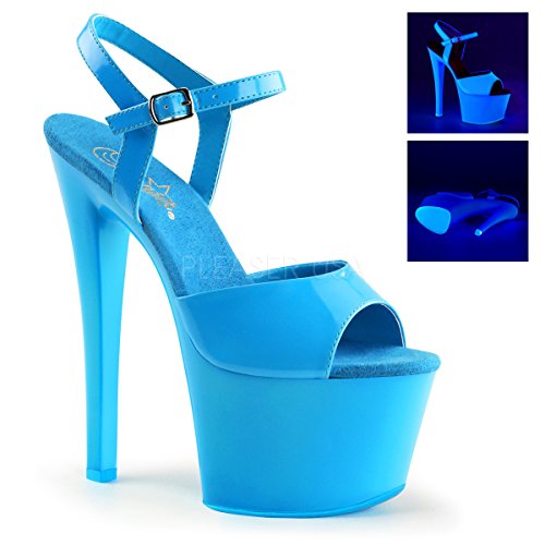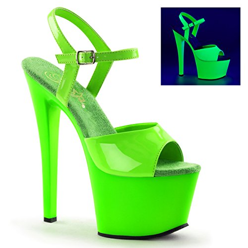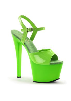 Product Description7 (18cm) heel 2 3/4 (7cm) pf ankle strap sandal featuring entire upper, platform bottom, and outsole/top lift neon uv reactive0