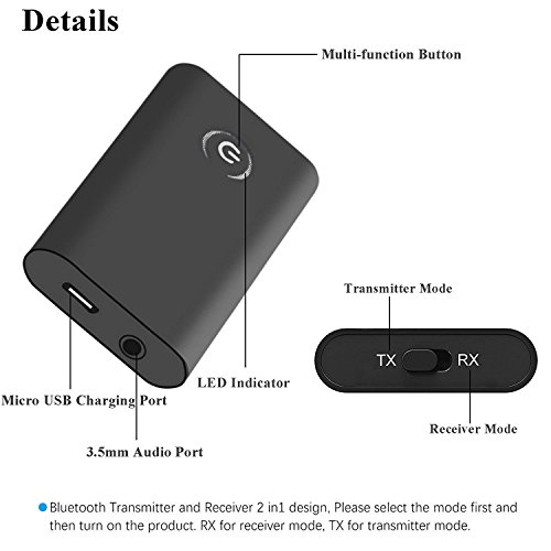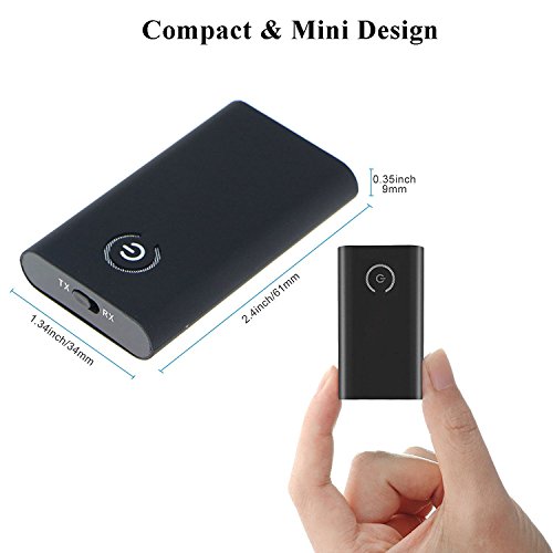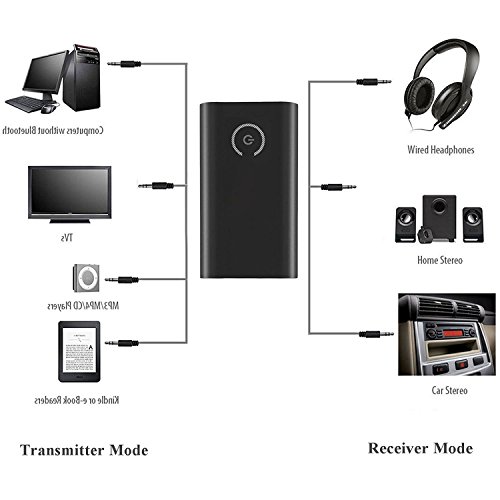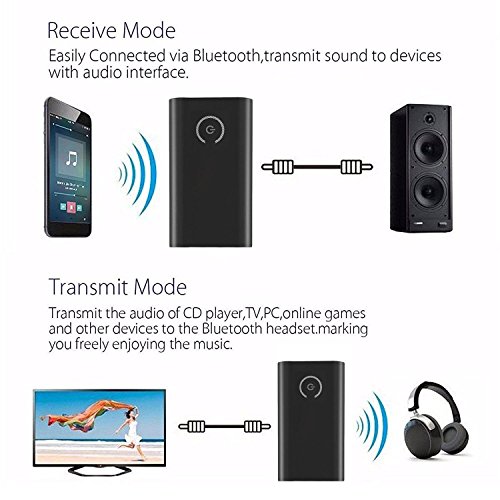 -. Feature : 2 in 1 Bluetooth adapter with Bluetooth receive and Bluetooth transmit function / Bluetooth transmitter: wirelessly streams audio to Bluetooth speakers or headphones from your TV or older media devices like portable CD players that lack built-in Bluetooth / Bluetooth receiver: wirelessly streams audio from your phone or tablet to your existing wired home stereo system, speakers, or headphones / Every time when the device power on, the transmitter will automatically connect to the last connected device. / Compatible with Android, IOS phone system and PAD and all Bluetooth audio devices such as TV ,Speaker, PC,CD Player, iPhone, iPod, iPad, Tablets , MP3 Player Or Car Stereo and More