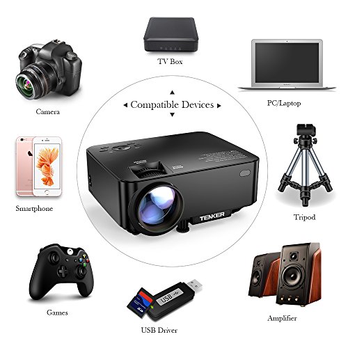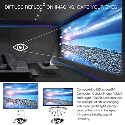 [ UPGRADE +10% LUMENS LED PROJECTOR ]: TENKER home cinema projector takes the latest LED technology, bring you high definition display images. Including 50,000-hour lifespan, native resolution 800*480, supports resolutions up to 1920*1080, ideal for home entertainment in dark, NOT RECOMMEND for PPT or business presentation.