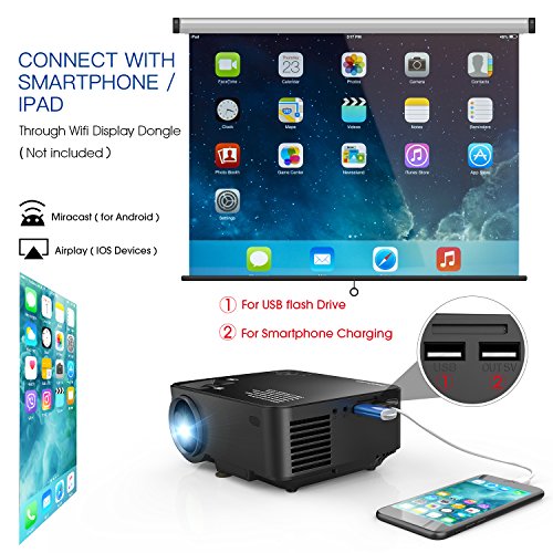 * A Wireless HDMI Dongle (not included) is required if you want to connect the projector to smartphones (which support MHL) and tablets. For Android phones, you need an MHL to HDMI cable. For iPhones & iPads, you need a Lightning to HDMI cable adapter.