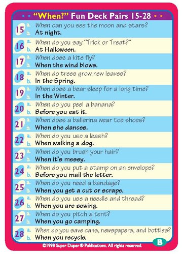 Teachers and parents send us more thank you letters about this innovative "Ask and Answer" card series than any other product we've ever developed. Why? The art is child-friendly; the "Who?, What?, When?, Where?, Why?" questions are easy to understand; and kids of all ages love to play card games...That's a winning combination! Ask and Answer "When?" Cards feature: