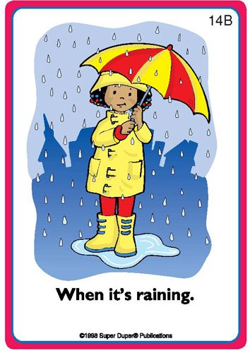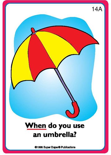 56 colorfully illustrated cards (2 1/2" x 3 1/2") - 28 pairs of "When?" Question/Answer cards (i.e., When do you wear a coat?... When it's cold outside)