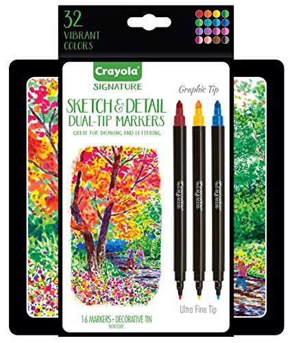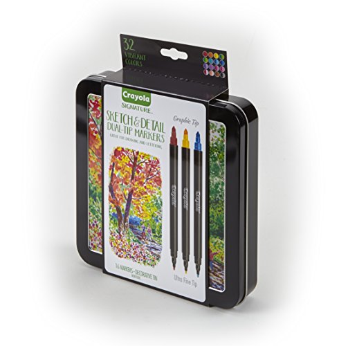 ReleaseDate : 2017-09-01 Studio : Binney Smith Publisher : Binney Smith Binding : Toy Product Description Customize your writing, drawing, and coloring with Crayola Signature Sketch Detail Dual-Tip Markers. Each marker features a super tip and an ultra-fine tip and delivers two vibrant shades for twice the versatility and double the coloring fun. Create fine lines or bold strokes with the versatile tips. Perfect for artists of any age, these 16 dual-ended markers come in an artist-rendered storage tin that helps keep the markers in pristine condition between uses. Sketch, write, draw, and blend colors with Crayola Signature Sketch Detail Dual-Tip Markers. 0