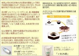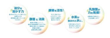 -. Feature : ・油分を溶かす力…油汚れがキレイに落ちるだけでなく、洗剤などの使用量を減らすことができるます。 / ・菌効果・消臭効果…雑菌が繁殖しにくく、食品の鮮度維持におすすめ。悪臭の源となる雑菌の繁殖を抑制し消臭効果を発揮します。 / ・酵素を活性!…サビに負けないカラダづくりを応援する酵素に働きかけます。 / ・水素を含んだ水に…水素を含んだ水なので体の内側から健康をサポートします / ・乳酸菌が力を発揮…おなかの乳酸菌を活性し力を発揮します。