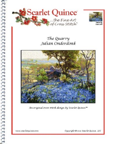 A counted cross stitch pattern of a field of Texas bluebonnets (a type of lupine) in the Texas Hill Country springtime. They are interspersed with a few scraggly mesquite trees and prickly pear cacti. In the background is a stone quarry with its buildings and a fence line and distant hills. (Impressionist, about 1915) This pattern is solidly stitched. Any color fabric may be used.Feature