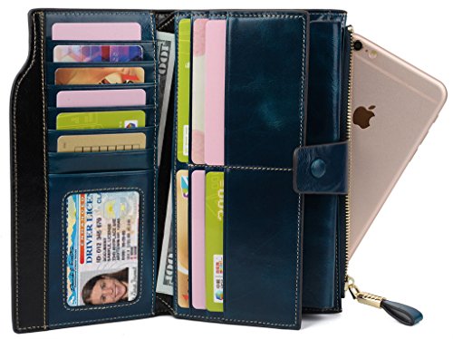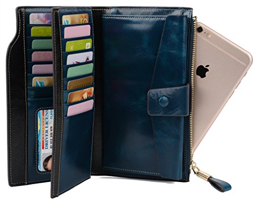 -. Feature : ➤HIGH QUALITY: Advanced Grained leather with wax finish, feels luxury and comfortable, which will look even better after using for a long time. Gold-color hardware, heavy duty zipper and detailed contrast stitching brightens up the wallet / ➤SUPER ORGANIZATION: 21 Card Holders, including 1 ID window; 3 cash compartments; 1 snap pocket and 1 zipper pocket. Zipper pocket can hold an iPhone 7 without case. Snap pocket can hold an iPhone 7 Plus without case. / ➤HUGE CAPACITY: With this wallet, you can carry 20 credit cards, 1 driver license/ ID, cash, coins, notes, receipts, cheekbook and your cellphone everyday. One wallet is enough for everyday use! / ➤QUICK ACCESS: Multi-storey fold is designed for you to keep your things well oraganized and provide quick access to the cards/cash/phone/coins you need. Save your from your busy life. / ➤Dimensions: 7.32"L x 4.05"W x 1.1"H . The Weight is 0.40 pounds. It is just the size for a wallet you can simply hold it on hand or put it in a medium bag.