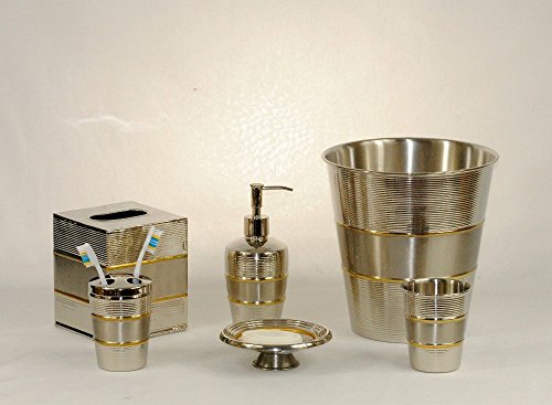 -. Feature : Solid Brass Nickel Plated and Stainless Steel / Hotel Quality / Sturdy and Durable / set of 6 / Lotion Dispenser, Soap Dish, Boutique Tissue Cover, Tooth Brush Holder, Tumbler, Waste Basket