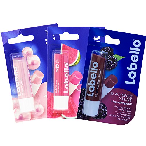 Labello Pearly Shine, Labello Watermelon Shine, Labelle Blackberry Shine Lip Balm Bundle