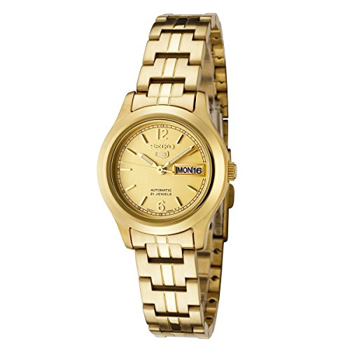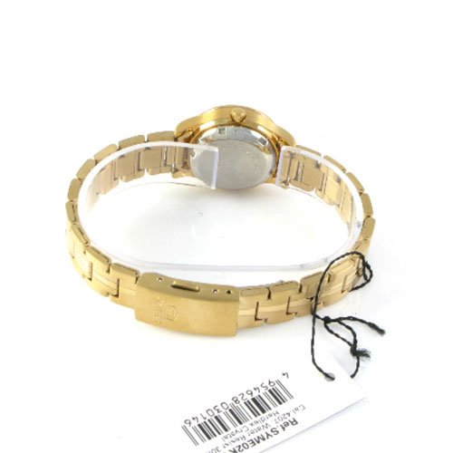 -. Binding : Watch -. Brand : Seiko -. Color : Gold -. Department : womens -. EAN : 0961613297501 -. Feature : Precise 21-jewel Japanese-automatic movement; functions without a battery; powers automatically with the movement of your arm / Durable mineral hardlex crystal; brushed and polished gold-tone stainless steel case and bracelet / Day function in english and spanish; date function / Gold dial with gold-tone hands and hour markers; luminous / Water resistant to 99 feet (30 M): withstands rain and splashes of water, but not showering or submersion -. Label : Seiko -. Manufacturer : Seiko -. Model : SYME02 -. MPN : SYME02 -. PackageQuantity : 1 -. PartNumber : SYME02 -. ProductGroup : Watch -. ProductTypeName : WATCH -. Publisher : Seiko -. SKU : B0015867C6 -. Studio : Seiko -. Title : Seiko Women's SYME02 Seiko 5 Automatic Gold Dial Gold-Tone Stainless Steel Watch -. UPC : 961613297501