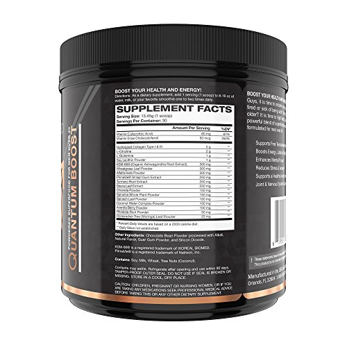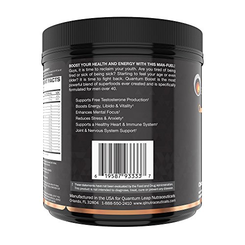 -. Feature : RICH CHOCOLATE POWDERED SUPERFOOD FOR MEN OVER 40 - We formulated Quantum Boost to the best tasting Super Green Powder on the planet. Now your green superfood doesn't have to taste- well, green! These amazing chocolate powdered greens can be mixed with your favorite smoothie or combined with water, milk, soy milk and consumed cold or hot. NO MINT, NO SUGAR, NO GRIT! / SCIENTIFICALLY ENGINEERED PROP.R.IETARY FORMULA - Turbo Charged with 17 of the highest quality, most potent essential ingredients available anywhere, Quantum Boost provides one of the greatest amounts of active ingredients per serving for optimal results. Experience the incredible immune system and libido boosting formula for yourself today. / FEEL HALF YOUR AGE - Our cutting-edge formulation helps support what many men over 40 have lost over the years. Quantum Boost in combination with exercise and a healthy diet helps support circulation, testosterone levels, skin, bone and joint health, inflammation, energy levels and unwanted anxiety. Many users also enjoy better mental focus, concentration and clarity. Hey- it's not the fountain of youth, but it could be the next best thing. / SUPER-HIGH QUALITY INGREDIENTS - As with all Quantum Leap Nutraceutical products, Quantum Boost is produced in our state-of-the-art, FDA approved, GMP certified lab in the USA. This ultra-premium formulation provides a "one stop shop" for your body's rejuvenation and nutritional replenishment needs. / RISK-FREE 100% SATISFACTION GUARANTEE - Order Quantum Boost today and try it out for 30 days. If you are not absolutely thrilled with the results, we beg you return it for a full refund, no questions asked.