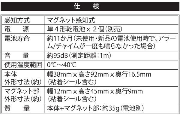 窓やドアが開いた場合に、大音量アラームまたはチャイムでお知らせ、アラームとチャイムはスイッチで切替できます。アラームの音量は約95dB(測定距離:1m)、スイッチをOFFにするまで鳴り続けます。チャイムは「ピンポーン」が2回(約5秒間)鳴ります。粘着シールの貼り付け面に「24時間警戒中」の文字がプリントされていますので、透明ガラスに貼り付けると外側から警戒文字が見えて、防犯に役立ちます。 |
