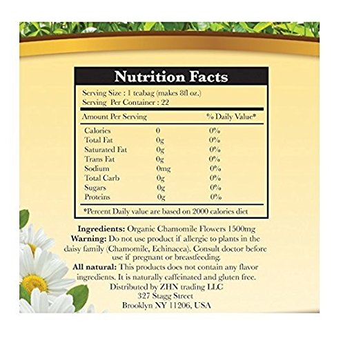 Studio : ZHN Publisher : ZHN Binding : Health and Beauty Product Description Chamomile has been used by people for centuries to relax. This Herb creates a soothing effect which helps to reduce sleeplessness and calm an upset stomach. Organic chamomile flowers used to create Raptures Herbs Chamomile tea are grown in healthy, certified organic conditions. Rapture's Herbs teas are strictly prepared to accordance with and meet all certified organic requirements. Relax with this calming tea after your busy day. 0